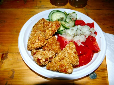 Minősítés: Kellemesen pikánsra fuszerezett csirke, tortilla morzsába forgatva és kiránva. Kis csalást követtünk el mert ezt már tegnap éjjel kipróbáltuk, de annyira jó volt hogy ma is ezt ettük. Mivel nem túl nehéz étel bármikor (akár éjfélkor is mint mi) bevállalható.